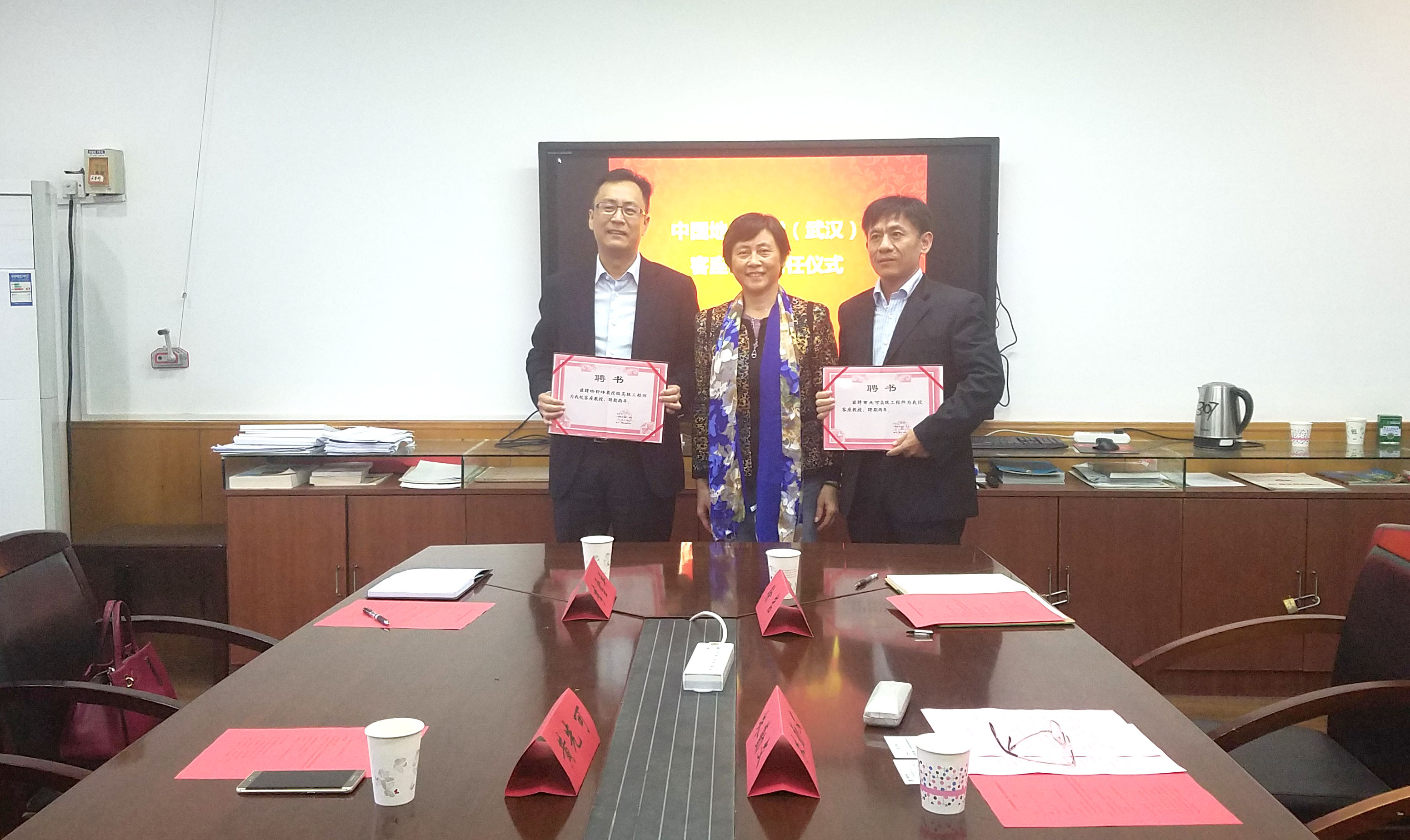 焦玉勇介绍了客座教授杨哲峰和黄先可的基本情况,朱勤文为两位客座教授颁发了聘书。