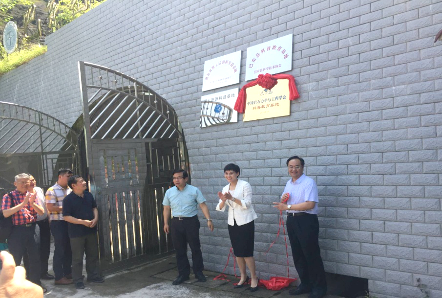 在巴东野外综合试验场,由中国岩石力学与工程学会李晓副理事长、地大党委副书记唐辉明教授和巴东县郭玲县长共同为科普教育基地揭牌。随后,全体成员参观考察了科普教育基地并合影留念。