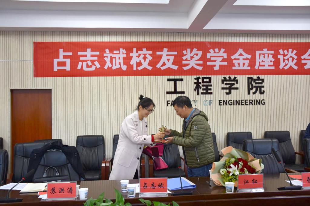 随后,段隆臣介绍了地质工程和勘查与技术工程专业发展情况。丁苗苗向占志斌校友赠送“地质工作者”雕塑模型。学生代表向占志斌夫妇献花。