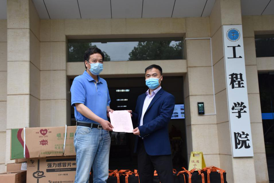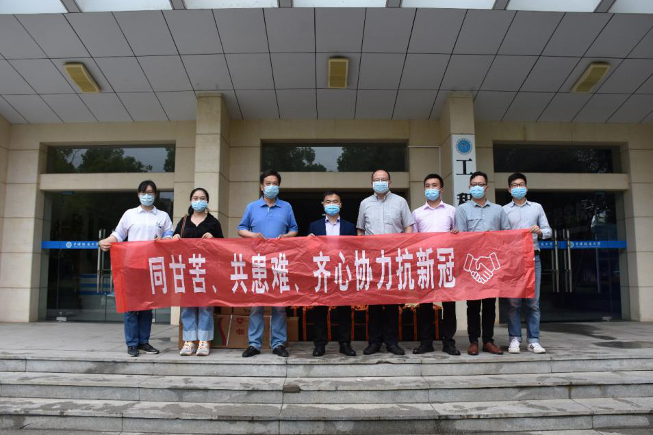 5月8日上午,上海华测导航技术股份有限公司湖北子公司总经理卢兴海、客户经理卢立飞一行向日本av中文字幕 捐赠防疫物资,学院党委书记陈飞、党委副书记江广长签收物资并代表学院表示诚挚感谢。在学校统筹疫情防控和开学工作的关键时刻,上海华测导航技术股份有限公司主动与学院联系,捐赠疫情防控物资口罩3000枚、测温枪10支、PVC手套50双、大小喷壶80个、84消毒液40升、免洗消毒液104瓶。为学院有序推进师生复岗开学提供了丰富的物质保障。