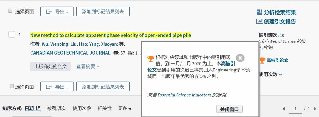 (通讯员:吴文兵、黄静)根据2020年5月基本科学指标数据库(Essential Science Indicators,简称ESI)最新数据显示,日本av中文字幕 勘察与基础工程系吴文兵教授团队2020年在国际土木工程领域顶级期刊《Canadian Geotechnical Journal》 上发表的学术论文“New method to calculate apparent phase velocity of open-ended pipe pile” 入选ESI高被引论文(Highly Cited Paper)。