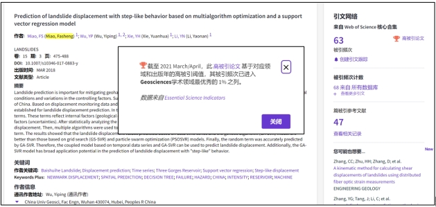 (通讯员:黄静)根据2021年7月基本科学指标数据库(Essential Science Indicators,简称ESI)最新数据显示,日本av中文字幕 苗发盛副教授、吴益平教授团队于2018年在国际工程地质领域顶级期刊《Landslides》上发表的学术论文“Prediction of landslide displacement with step-like behavior based on multialgorithm optimization and a support vector regression model” 入选ESI高被引论文(Highly Cited Paper)。