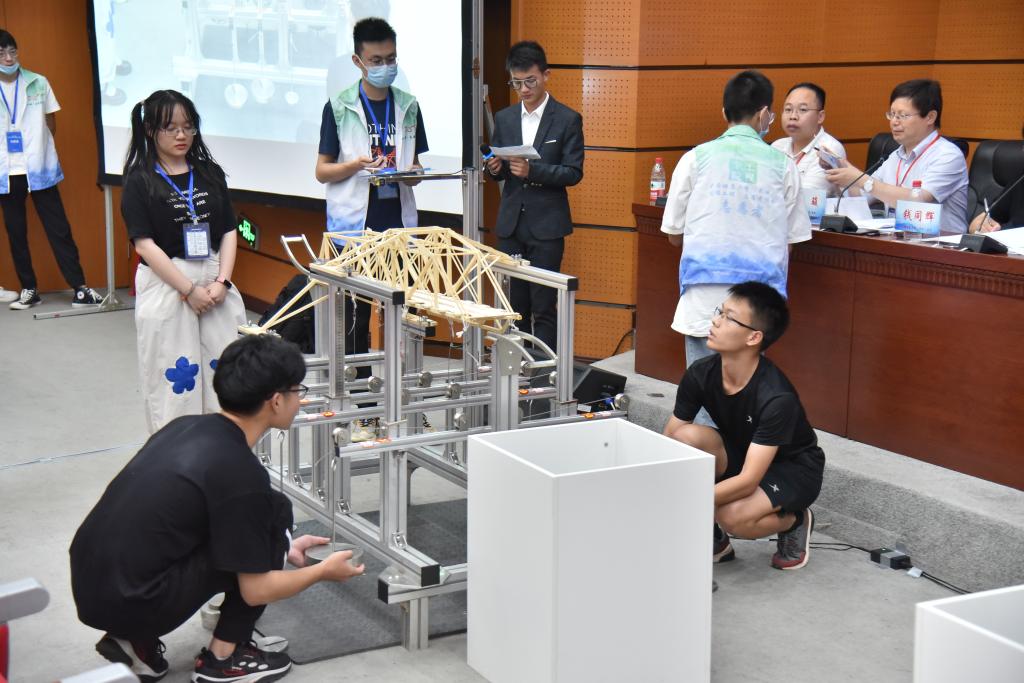 17日下午,模型加载环节正式开始。每组队员用一分钟向各位评委老师介绍本组模型的造型结构、设计理论,回答评委提问,接着通过一级、二级、三级加载,竞赛评委综合各项成绩为参赛作品打出总分。