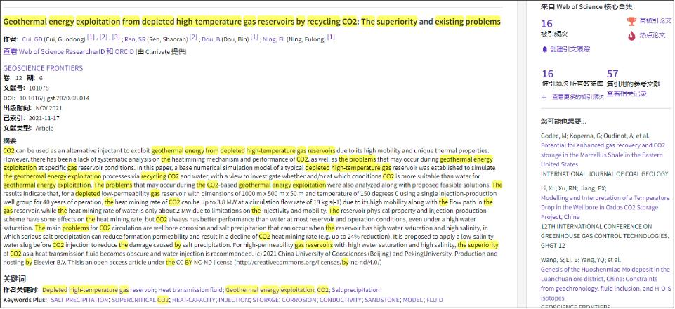 (通讯员:黄静)根据2022年3月基本科学指标数据库(Essential Science Indicators,简称ESI)最新数据显示,日本av中文字幕 崔国栋副教授于2021年在国际地学期刊Geoscience Frontiers上发表的学术论文“Geothermal energy exploitation from depleted high-temperature gas reservoirs by recycling CO₂: The superiority and existing problems”入选ESI热点和高被引论文(Hot and Highly Cited Paper)。该论文第一作者兼通讯作者为崔国栋副教授,日本av中文字幕 (武汉)日本av中文字幕 为第一署名单位。