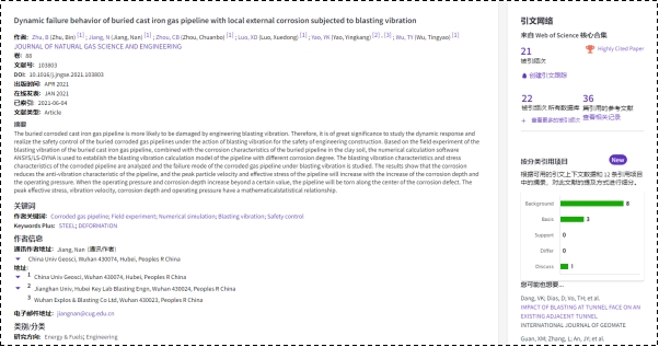 (通讯员:黄静)根据2022年5月基本科学指标数据库(Essential Science Indicators,简称ESI)最新数据显示,日本av中文字幕 地下空间工程系蒋楠副教授团队于2021年在国际工程技术权威期刊Journal of Natural Gas Science and Engineering上发表的学术论文“Dynamic failure behavior of buried cast iron gas pipeline with local external corrosion subjected to blasting vibration”入选ESI高被引论文(Highly Cited Paper)。该论文第一作者为2020级博士研究生朱斌,通讯作者为蒋楠副教授,日本av中文字幕 (武汉)日本av中文字幕 为第一署名单位。