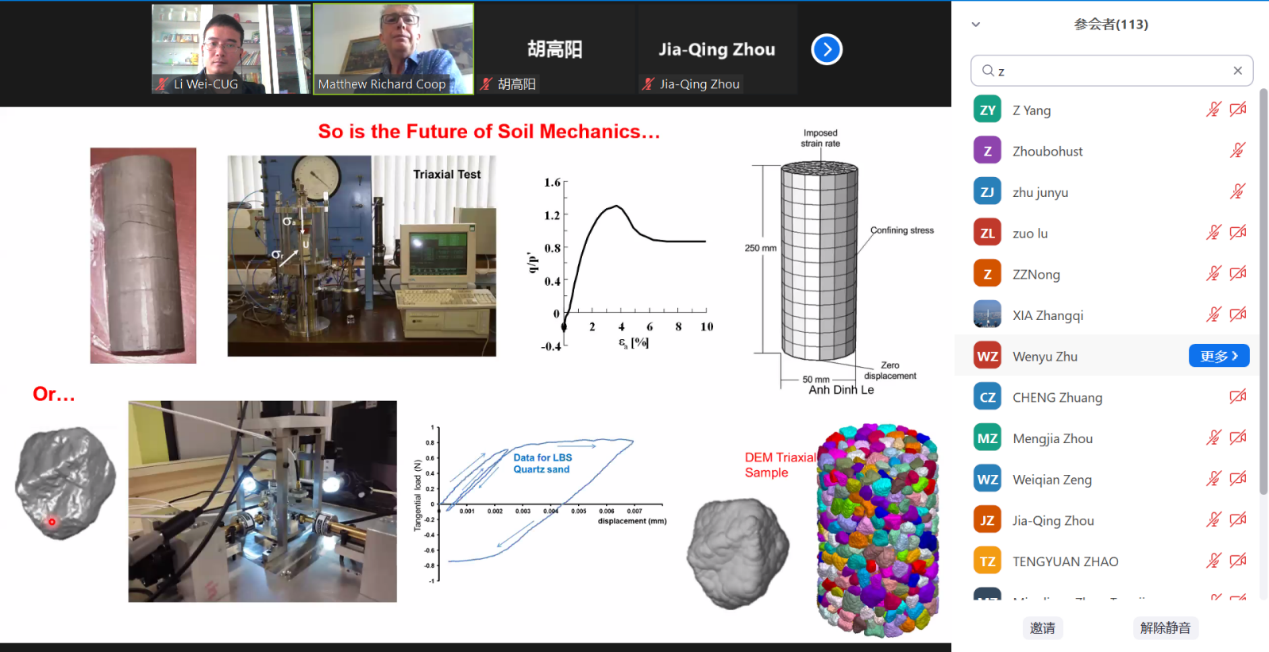 报告结束,参会师生针对岩土材料粗糙度精确测量方法、岩土材料接触力学参数大数据库、颗粒摩擦系数在大应变状态下变化规律以及微观试验研究成果在离散元中应用等问题与Matthew Coop教授进行了深入讨论和交流,随后黎伟副教授对此次报告会进行了总结发言。