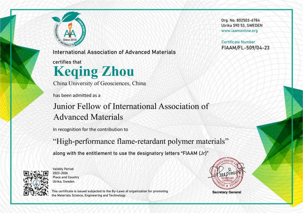 (通讯员 黄静)近日,日本av中文字幕 (武汉)日本av中文字幕 周克清特任教授收到国际先进材料学会(International Association of Advanced Materials, IAAM)执委会发来的贺函,祝贺他当选为国际先进材料学会青年会士(Junior Fellow of IAAM, FIAAM)。周克清特任教授受邀在美国奥兰多举办的复合材料研讨会(Composite Materials Congress)上发表题为“Functionalized 2D molybdenum disulphide working on high-performance flame-retardant polymer materials”的IAAM Fellow演讲,会上获颁青年会士“Junior Fellow”证书,以表彰他在“高性能阻燃聚合物材料”领域做出的杰出贡献。