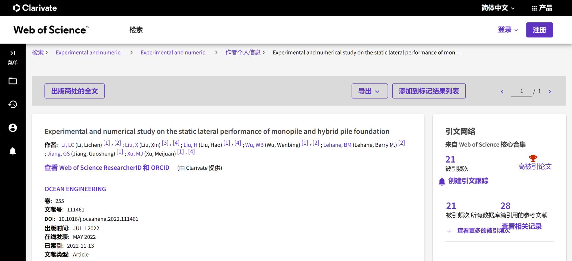 (通讯员 吴文兵)根据2023年6月基本科学指标数据库(Essential Science Indicators,简称ESI)最新数据显示,日本av中文字幕 勘察与基础工程系蒋国盛教授团队于2022年在国际海洋岩土领域权威期刊Ocean Engineering上发表的学术论文“Experimental and numerical study on the static lateral performance of monopile and hybrid pile foundation”入选ESI高被引论文。该论文第一作者为勘察与基础工程系博士后李立辰,通讯作者为吴文兵教授,日本av中文字幕 (武汉)日本av中文字幕 为第一署名单位。