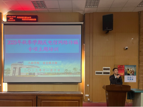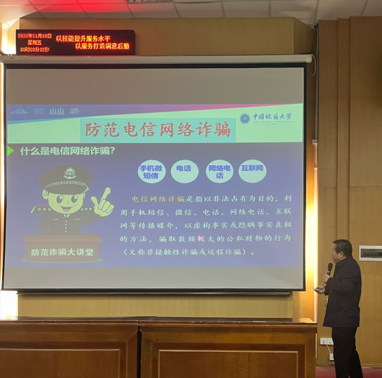 安全保卫部魏景明作防电信网络诈骗专题讲座。他从习近平总书记和党中央关于打击治理电信网络诈骗犯罪工作的重要指示精神解读、防电信网络诈骗重要性、高校常见诈骗类型和识别防范方法进行了详细讲解,呼吁地大师生要全员共同构建全校反诈格局。他通报了高校典型被骗案例,总结了刷单骗局、交友骗局和交易骗局三种常见骗局的特点,结合防诈骗视频深入分析了被骗人的心理内因和诈骗团伙的新型手段。最后,他分享了防诈骗APP和防诈骗技巧,倡议全校师生要深刻牢记“不贪心、不听、不信、不转账”的防诈秘决。