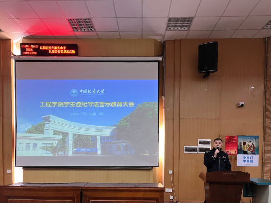 学院党委副书记高晓东讲话。他指出,遵法、懂法、敬法、守法是对社会公民的基本要求,是对高校大学生思想和行为的底线约束,是当代青年成长为堪当民族复兴大任的时代新人的基本保障。作为新时代地大青年,一是要从全面依法治国战略的高度认识宪法法律法规学习的重要性,要认识到青年是法治中国建设的基础和希望,校园是开展青年法治教育的重要阵地,要采取集中学习和自主学习相结合、听取讲座和开展宣讲相结合等方式开展法律法规学习,强化规矩意识和法治思维,学会遵纪守法和合理维权,扣好人生第一粒扣子;二是要从大学生涯规划、职业生涯规划和人生发展规划的视角看待遵守校纪校规的重要性,牢牢把握“纪在法前、纪严于法”的原则,认识到高校纪律规矩对标约束的是“象牙塔”里的高知人群,支持的是“未来社会主义事业的建设者和接班人”的成长与发展,全体大学生理应对自己的思想和行为设置更高的标准和要求,争做遵规守纪的典范;三是要从“做强国建设、民族复兴的主力军”的视角对待大学主责主业,全体工程青年要潜心学课程、做学问、搞科研,用好宝贵的大学时光,产出更多、更高质量、更具影响力的研究成果,同时要注意守牢考风考纪和学术诚信底线。他还嘱咐全体同学,要积极参加心理普查,规律参与体育锻炼,不做“脆皮大学生”,要在初冬季节筑牢宿舍、教室、学习室、实验室用电安全“防火墙”,在校园车辆越来越密集的形势下筑牢交通出行安全“防火墙”,在防电信网络诈骗依然严峻复杂的形势下筑牢财物安全“防火墙”,共同为文明校园建设和个人成长发展营造良好的环境。
