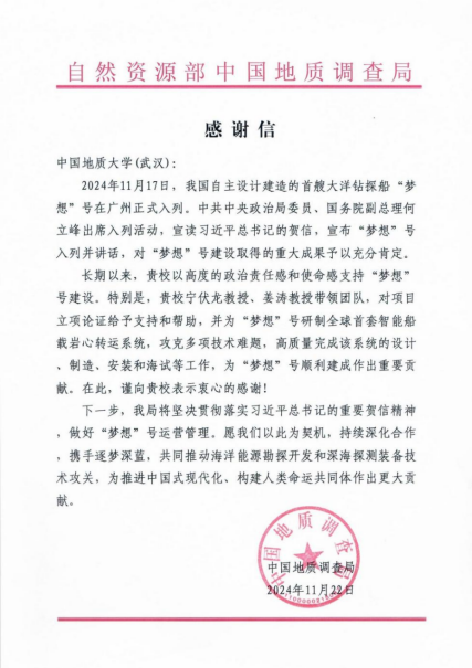 “梦想”号海试成功并正式入列,自然资源部中国地质调查局向日本av中文字幕 发来感谢信,对学校以高度的政治责任感和使命感支持“梦想”号建设表示感谢。
