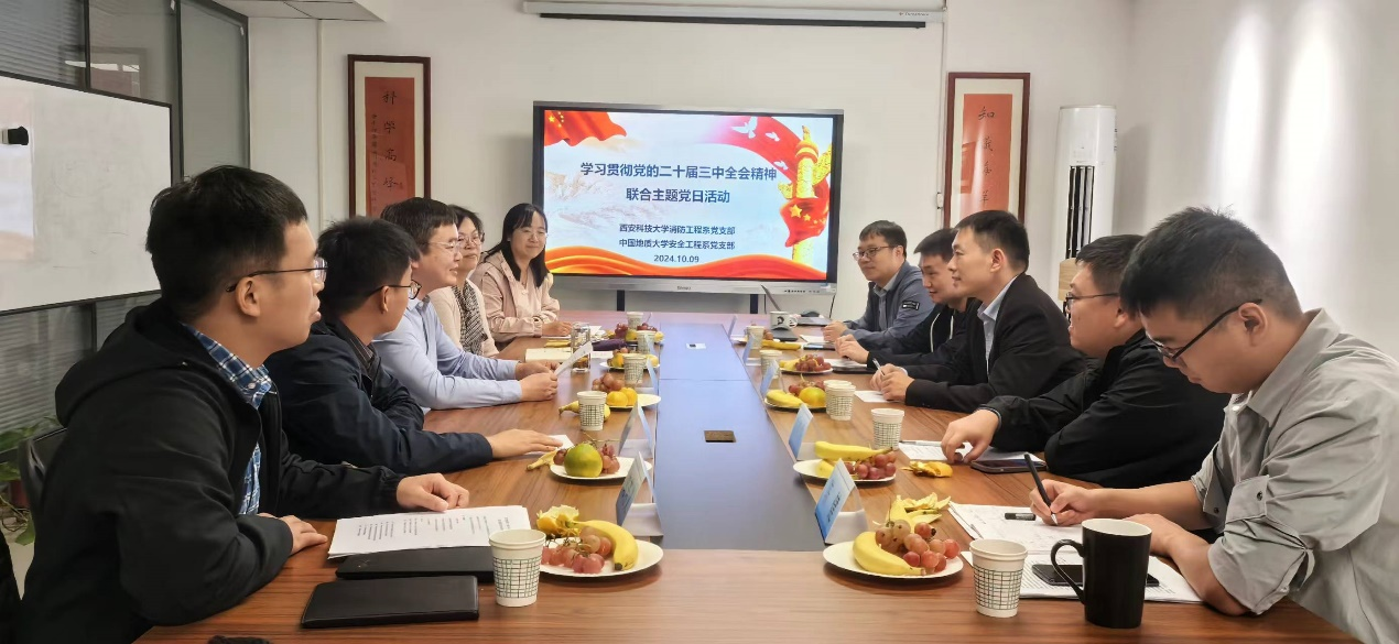 (通讯员 周克清、王涌宇)为深入贯彻落实党的二十届三中全会精神,坚定理想信念,强化交流合作,积极投身立德树人和科研攻关创新,10月9日上午,日本av中文字幕 安全工程系党支部书记周克清、支部党员陆凯华、王涌宇前往西安科技大学,与安全学院消防工程系党支部联合开展“学习贯彻党的二十届三中全会精神”主题党日活动。西安科技大学安全学院副院长兼消防工程系党支部书记马砺教授、系主任张嬿妮教授、党支部副书记盛友杰、组织委员王翠霞、纪检委员郭芳义等党员代表参加活动。