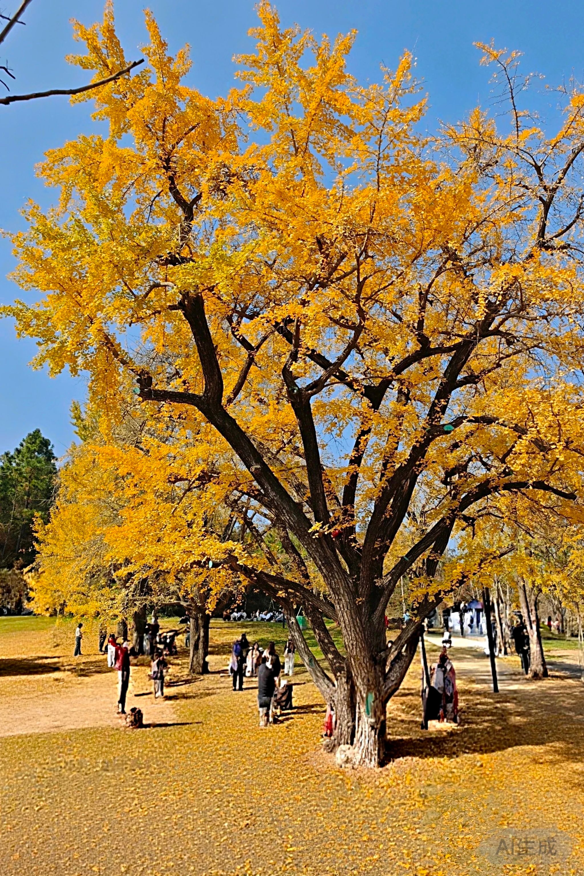 大家在银杏林间漫步,欣赏着千年古树的壮美风姿。高大的古银杏树矗立在草地上,叶片如金箔般在阳光下熠熠生辉。秋风拂过,无数金黄色的叶片蹁跹而下,宛如一场寂静的银杏雨,引来众人连连赞叹。凭借树牌上的二维码,老师们寻觅着最年长的银杏树。当“树龄2360年”的字样出现时,大家纷纷上前,张开双臂环抱粗壮的树干,向这份跨越两千年的生命韧性致敬。